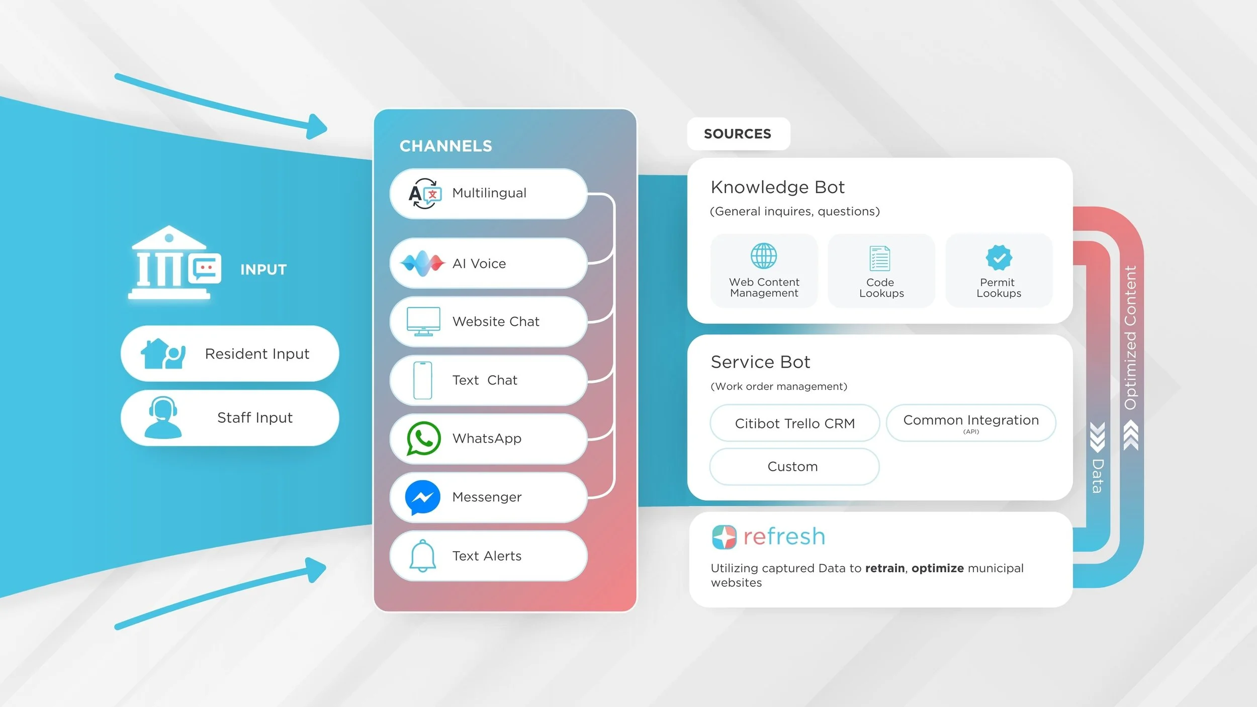 Citibot’s AI connects directly to the resources your city already provides—like your municipal website, internal databases, and public documents. By pulling from these trusted sources, it delivers fast, accurate answers to residents without needing new content sources or extra work from staff.