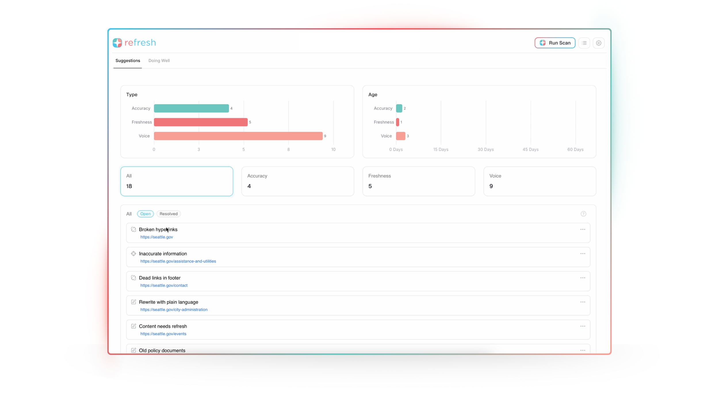 Refresh scans your website and surfaces issues across accuracy, freshness, voice, and accessibility. For each issue, it: