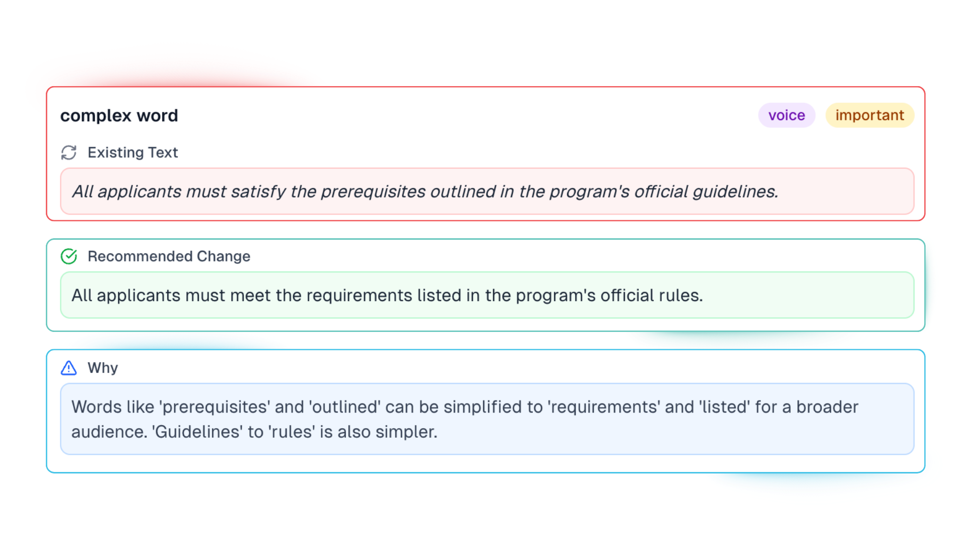 Every recommendation includes the why: why the change matters, why the suggested version is correct, and how it improves trust, clarity, accessibility, or resident experience.