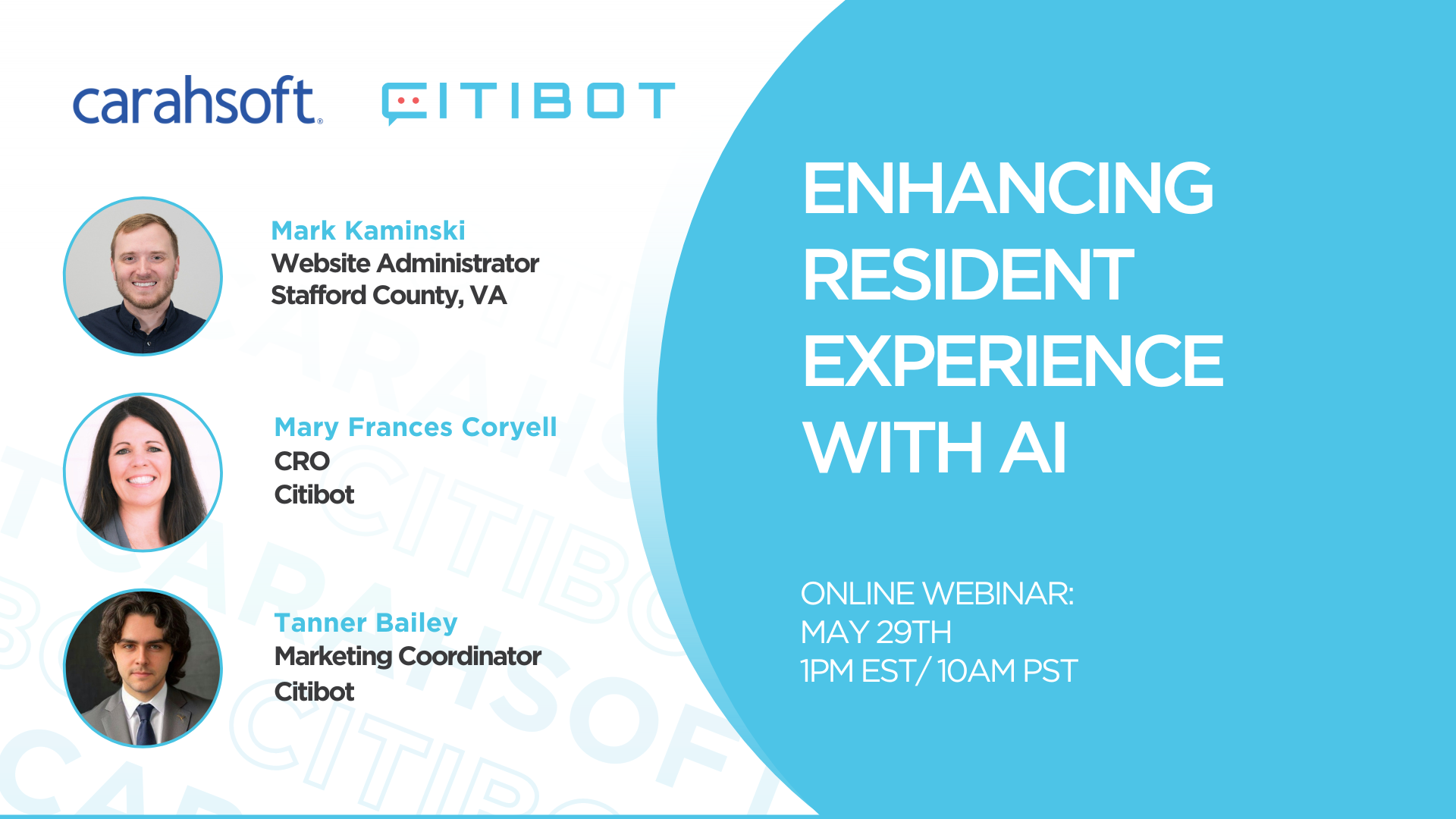 Watch this on-demand joint webinar with Carahsoft and Citibot as we explore the transformative impact of AI on resident experience, featuring insights from special guest Mark Kaminski of Stafford County, Virginia—recipient of the 2024 GovX Overall County Government Experience Award.
